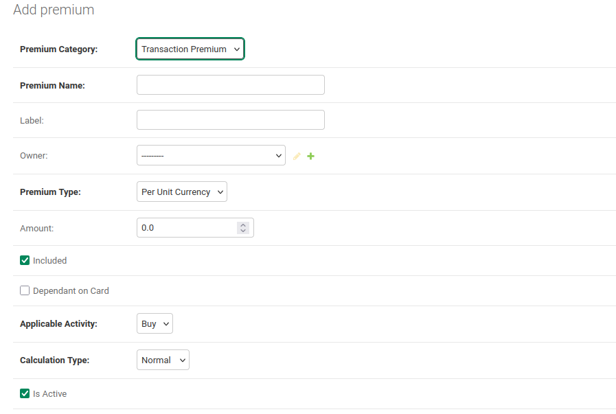 Premiums are additional charges applied to transactions. If the premium type is selected as โper transactionโ the premium is applied for transaction once, regardless of the quantity. Below are some of the fields to configure the Premiums. They are dropdowns and only one can be selected per field.- Premium Type