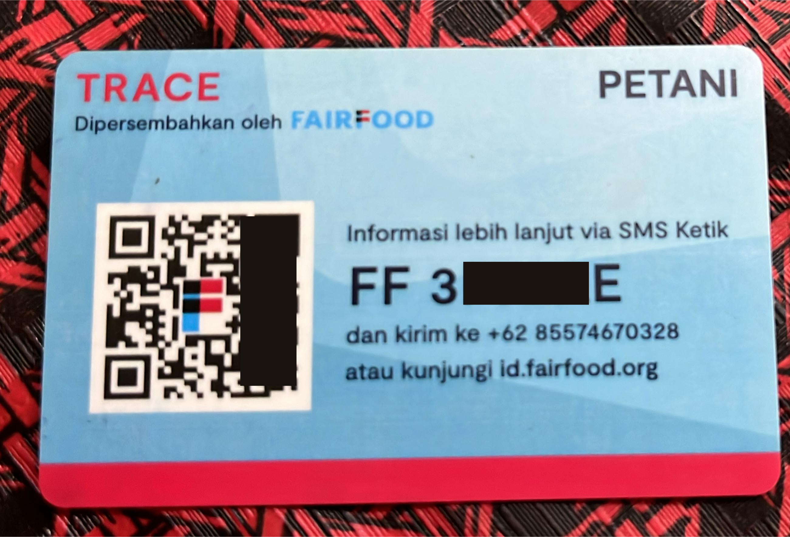 A QR code is displayed on the front side of the card. This QR code is used to identify the assigned farmer by scanning it with the Connect app during transactions.