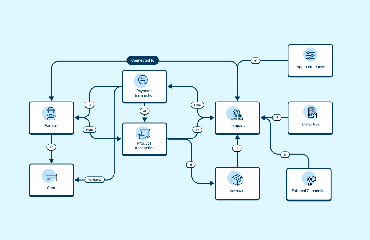The core modules of TraceConnect primarily revolve around companies, farmers, their transactions, and the customization of data connections for the Trace mobile app. Here are the key core modules: Authentication (Auth): This pivotal module is responsible for user management and access control within TraceConnect. It empowers administrators to define and manage user roles and permissions, ensuring that users have the appropriate level of access to the system’s features. In addition to handling internal user authentication, the Auth module plays a crucial role in managing OAuth connections for external services. This includes the secure integration of external applications and services, enhancing the overall security and functionality of TraceConnect. Supply Chain: The Supply Chain module serves as the backbone of the system, encompassing the comprehensive management of the supply chain structure. This includes the tracking of companies, farmers, products, and their interconnected relationships. Within this module, the crucial task of managing farmer cards is executed, providing a seamless means of validation during transactions and interactions within the supply chain. The Supply Chain module ensures that all stakeholders are effectively interconnected, contributing to the streamlined flow of goods and information. Transactions: At the heart of TraceConnect’s functionality lies the Transactions module, where all transactions between companies and farmers are meticulously recorded and managed. This encompasses a wide range of activities, including product transactions and the tracking of farmer payments. Configurations (Configs): The Configurations module is dedicated to tailoring the TraceConnect experience to suit specific requirements. It offers administrators the ability to customize various aspects of the app’s functionality. This includes configuring premium settings, allowing for the fine-tuning of features, and controlling user access privileges. Importantly, administrators can make on-the-fly adjustments, such as enabling or disabling the “Buy” feature for specific collectors, ensuring that the system remains agile and adaptable to evolving needs. Forms: Within the Forms module, administrators can configure custom forms to collect additional data relevant to their specific workflows. These forms provide flexibility and versatility, allowing TraceConnect to capture and process a wide array of data types. Whether it’s capturing unique data points or adapting to changing data requirements, this module empowers users to enhance their data-capturing capabilities, ultimately improving the precision and completeness of their records.Database Architecture