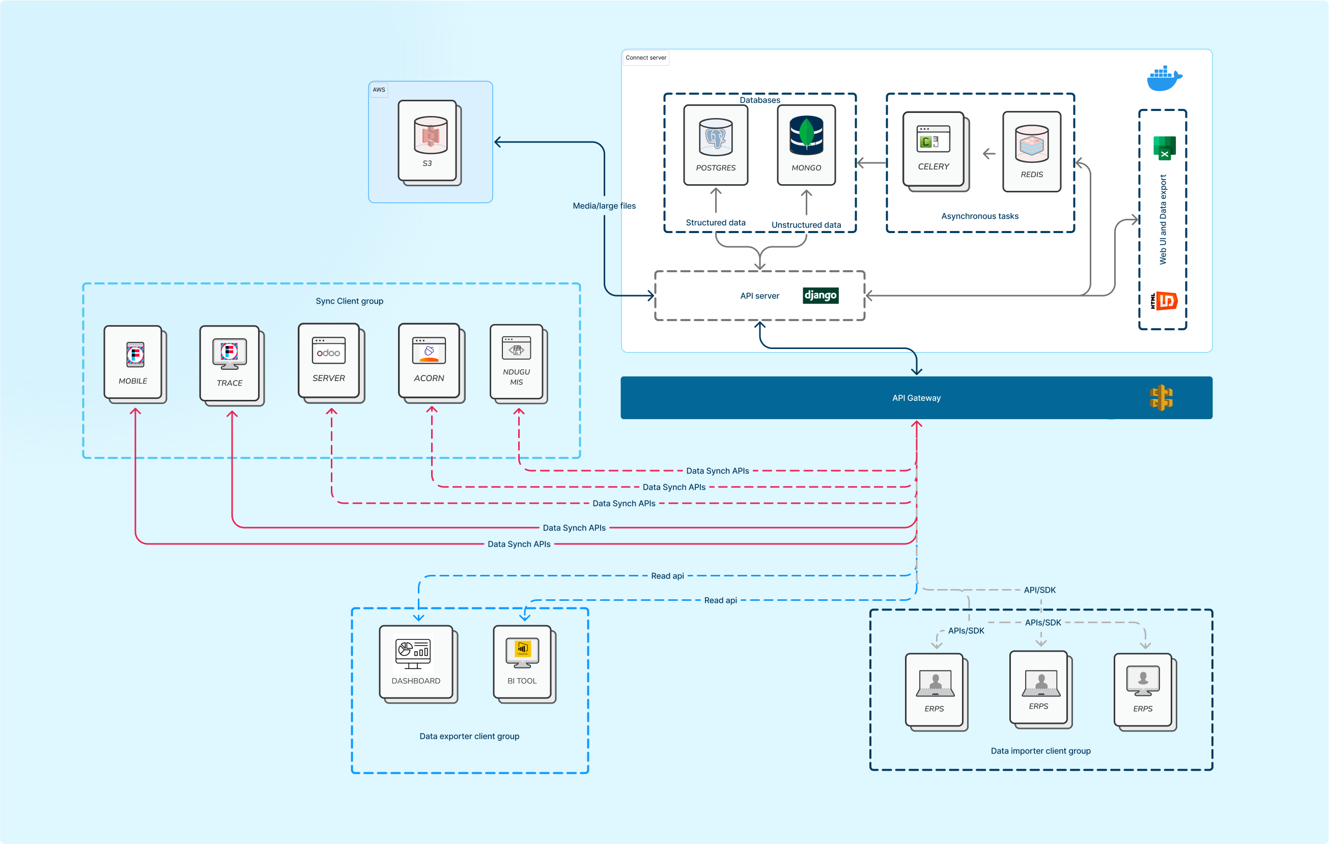 Our goal with Trace Connect is to achieve the following objectives: Standalone Backend for Trace Mobile App: Serve as a backend for the Trace mobile app, allowing users to deploy their own cloud-based instances of the app independently of the main Trace system. This will include configurations like premium payments and access control. Data Synchronisation: Guarantee smooth data synchronisation between the Trace mobile app, Trace system, and other external systems, enabling effortless two-way data transfer. Enable the easy import of data from external sources into Trace, as well as the efficient export of data from Trace to external systems, to ensure a fluid exchange of data throughout the ecosystem. Integration Hub: Act as a central integration hub, facilitating the exchange of data between external systems and ERPs with Trace through APIs and the Connect SDK. Additional Data Collection Agent: Enable the Trace app to support the creation of new or extra fields for data-gathering purposes. While Connect will function as a data collection agent, focusing mainly on basic farmer data and transactions, it is not intended for use as a survey instrument. However, it can serve as a central point for integrating additional data from various systems. Modular and Scalable: Design the system to be modular and scalable, allowing for future expansion and integration with evolving technologies and requirements.System Architecture